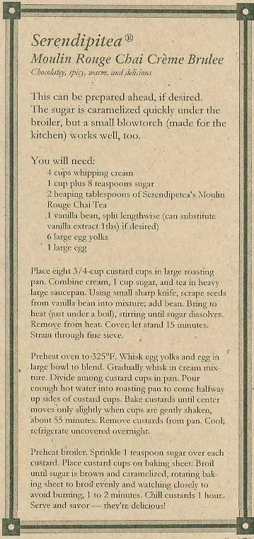 SerendipiTea is tirelessly exploring the seemingly endless uses and applications of the wondrous camellia sinensis ~ Tea. To our delight, quite a few of our Restaurant and Cafe customers have created fabulous recipes using tea (and some Tisanes) as an ingredient. Some of these locations have generously agreed to share their secrets with us and You!
